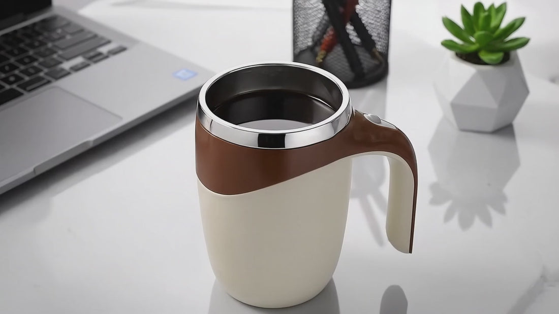 Stainless steel mug with automatic mixing at the push of a button. Perfect for coffee, tea or protein shakes, with a spill-proof lid and USB charging.